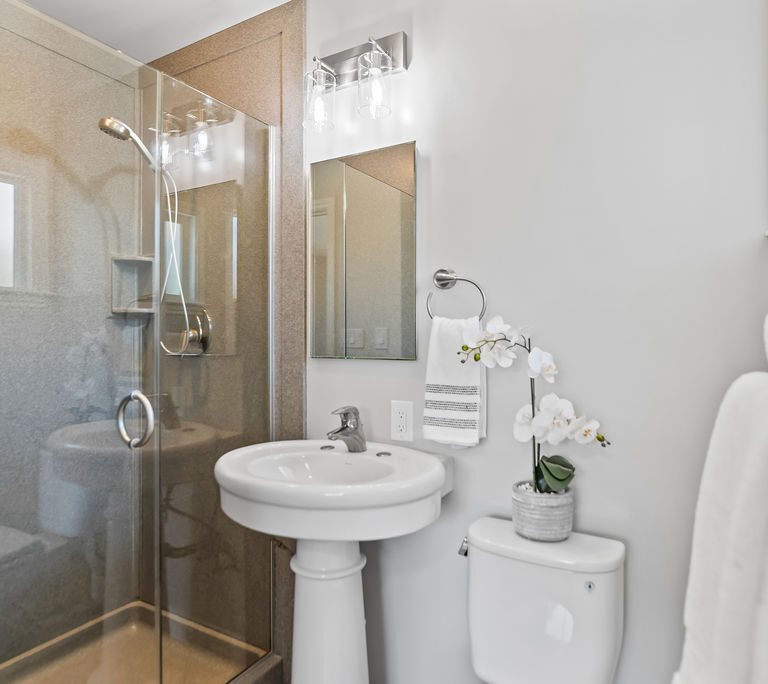 Attached in-law suite accessible through home’s living room or via private exterior entrance boasts large living room, open-concept kitchen, two bedrooms including en-suite primary with walk-in closet, ample natural light from large windows, and thoughtful details like wainscoting.