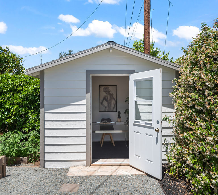 Charming front yard has white picket fence and apple, plum, and avocado trees! Backyard designed for enjoyment and functionality with large deck, raised vegetable beds and passion fruit vine, partially finished shed perfect for office or playroom, and wide paved side yard for more seating or extra storage.